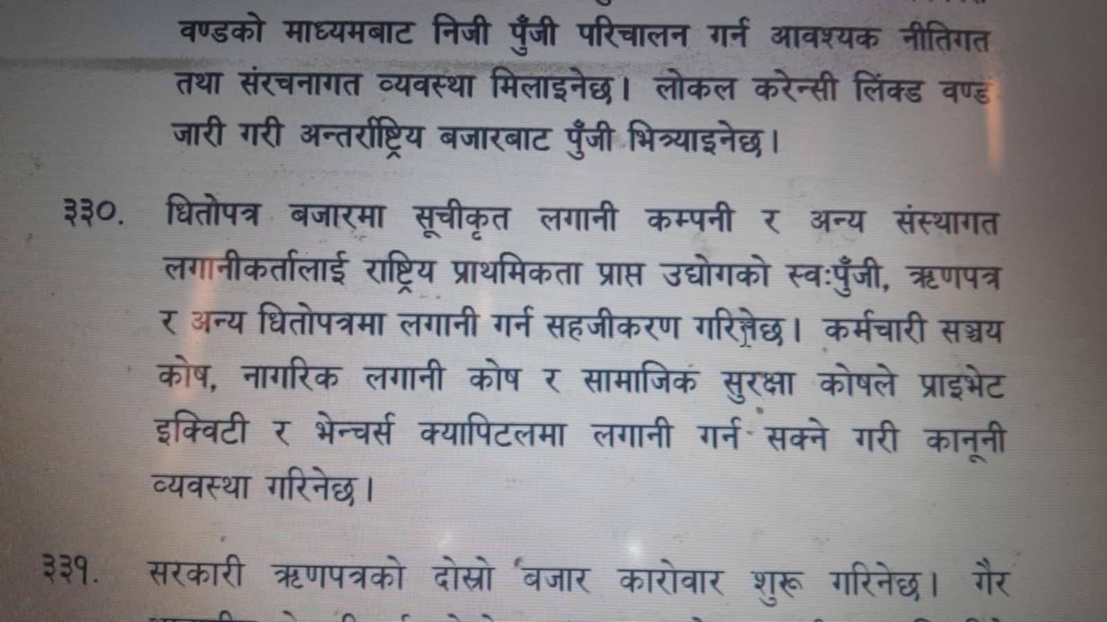 औद्योगिक व्यवस्था ऐनको दफा १९ को आधारमा सोही ऐनको अनूसूची ९ ले विभिन्न १७ वटा क्षेत्रका उद्योगहरुलाई राष्ट्रिय प्राथमिकता प्राप्त उद्योग भनी परिभाषित गरेको छ । यसमा उर्जा, पूर्वाधार, निर्यातमूलक उद्योग, खानी, पर्यटन, स्वास्थ्य, कृषि, प्रशोधन उद्योग, सूचना प्रविधि, हवाई सेवा, केवलकार, ग्रिन हाईड्रोजनलगायतका उद्याेगहरु छन् । त्यसैगरी अहिले सरकार र विभिन्न कम्पनीहरुले निष्काशन गर्ने ऋणपत्रको बजार चलायमान हुन नसकेकोमा अब लगानी कम्पनीहरुले त्यसमा पनि लगानी बढाउन पाउने भएका छन् । अन्य धितोपत्रहरुमा लगानी गर्न लगानी कम्पनीहरुले दोस्रो बजारमा खरिद बिक्री खुला हुने भएको छ ।