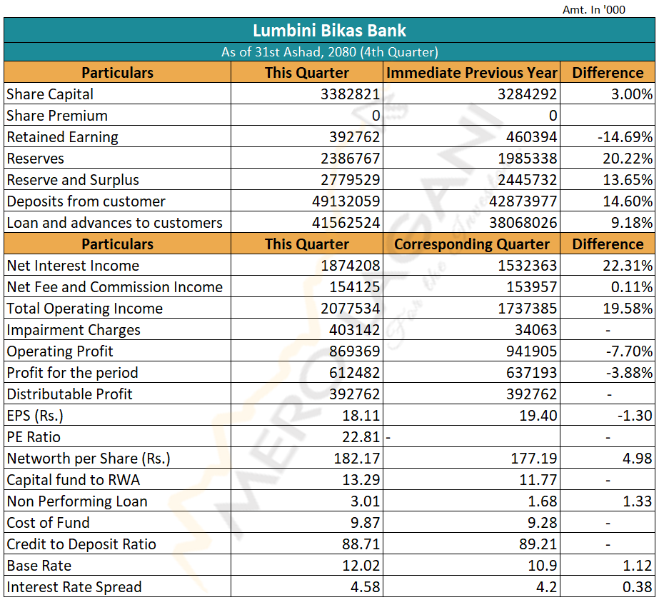 बैंकले गत आर्थिक वर्षको असार मसान्तसम्ममा ६१ करोड २४ लाख रुपैयाँ खुद नाफा आर्जन गरेको छ। यो अघिल्लो आर्थिक वर्षको सोही अवधिको तुलनामा ३.८८ प्रतिशत कम हो। गत आर्थिक वर्षको सोही अवधिसम्ममा बैंकले ६३ करोड ७१ लाख रुपैयाँ खुद नाफा आर्जन गरेको थियो।